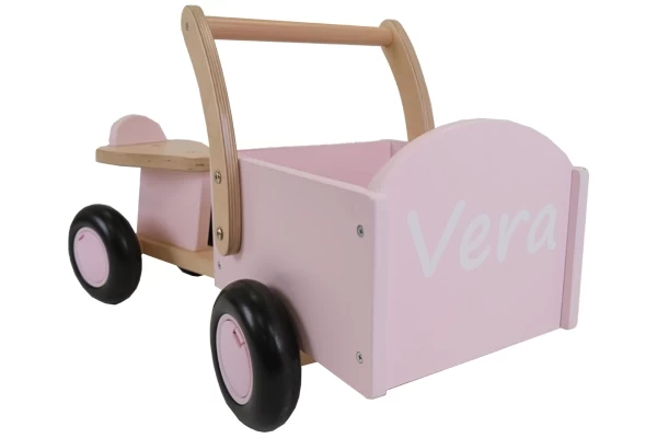 Een prachtig houten bakfietsje voor kids vanaf 1 jaar. Uitgevoerd in een prachtige lichtroze kleur. Op het zadel zit een handig opzetstukje tegen het afglijden. De zithoogte is 22,5 cm. De bakfiets staat stabiel op vier wielen. Deze zijn overigens geluidsarm en maken geen krassen. De Little Rider is zowel binnen als buiten te gebruiken. Het stuur heeft een vaste hoogte van 39 cm. Voorop zit natuurlijk die leuke bak voor allerlei spulletjes!